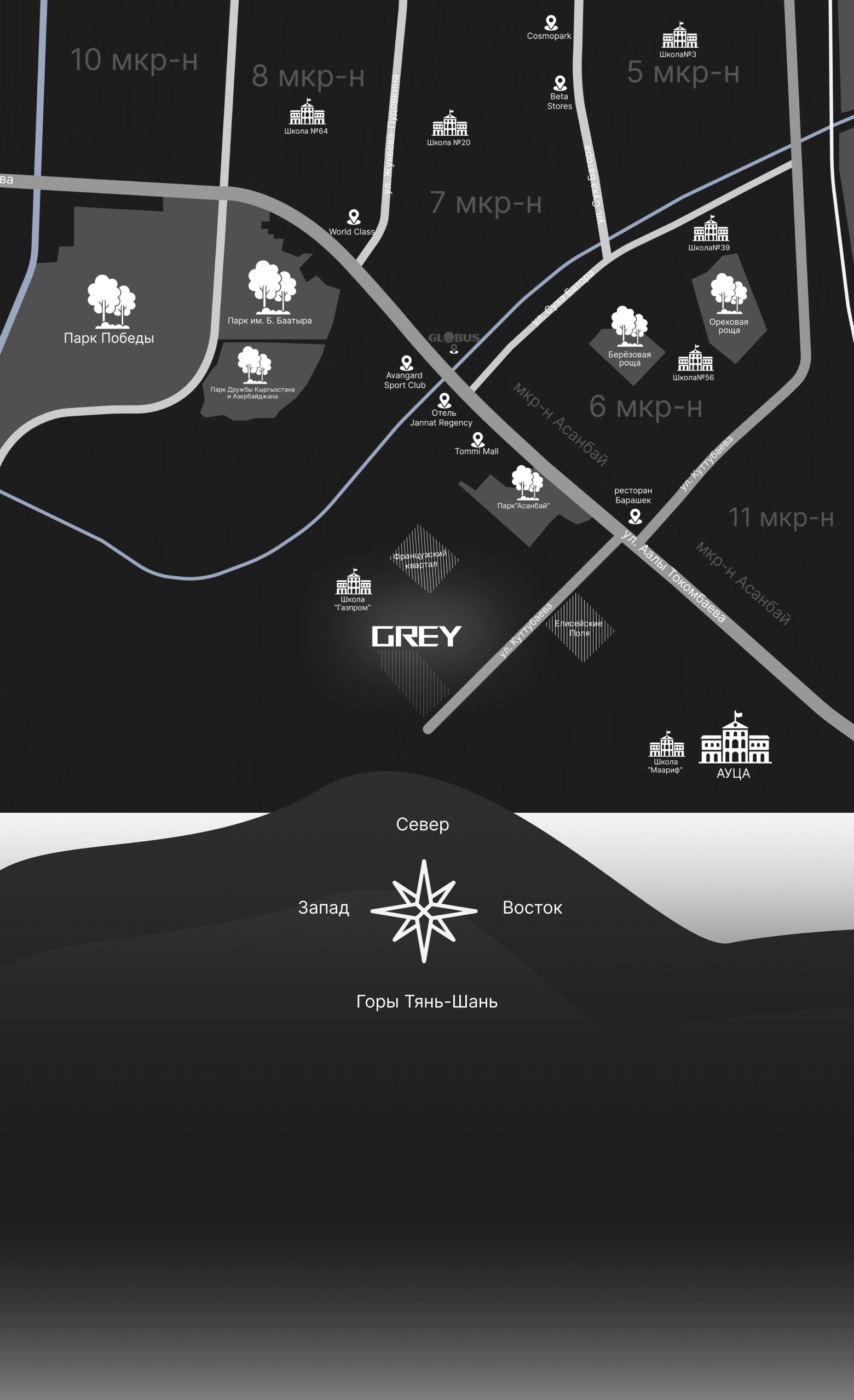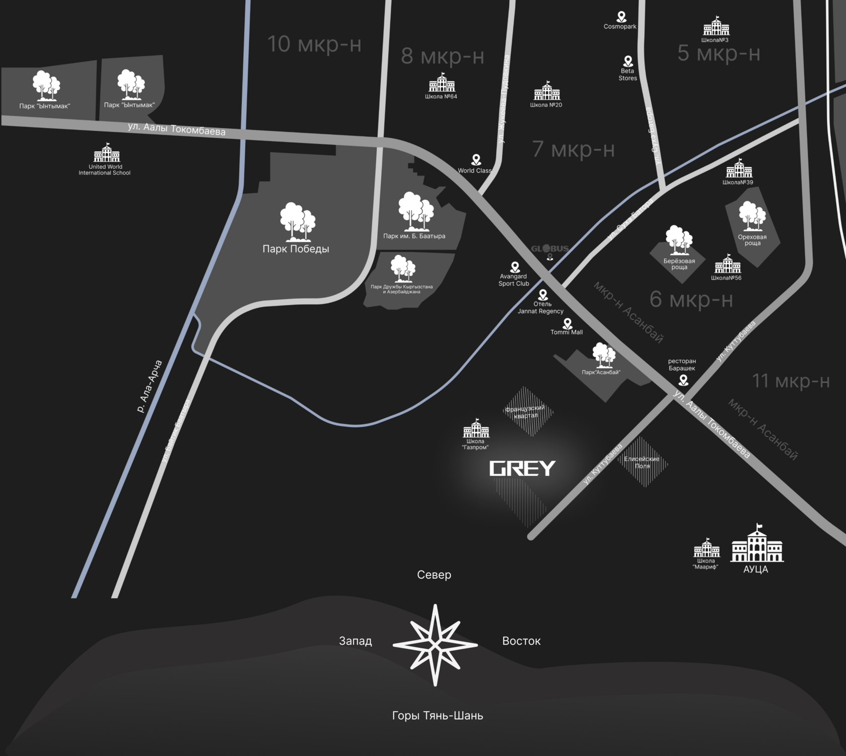 ЖК Grey расположен в южной части Бишкека и считается одним из самых дорогих и экологически благоприятных за пределами центра. Здесь сосредоточена элитная недвижимость, парковые зоны, развлекательные центры