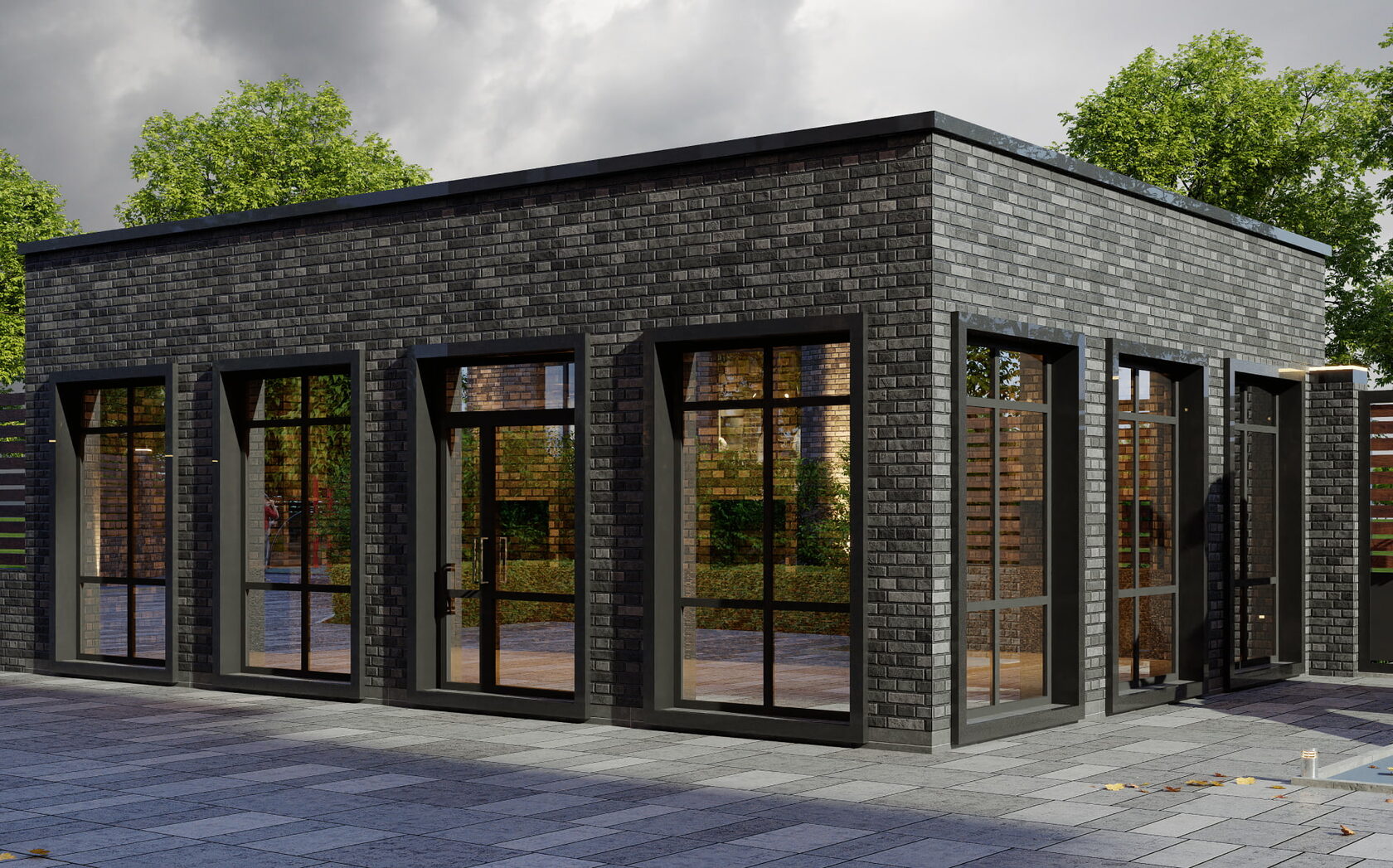 Фасад из серого клинкерного кирпича с панорамным остеклением эффектно выделяется среди архитектурных решений района