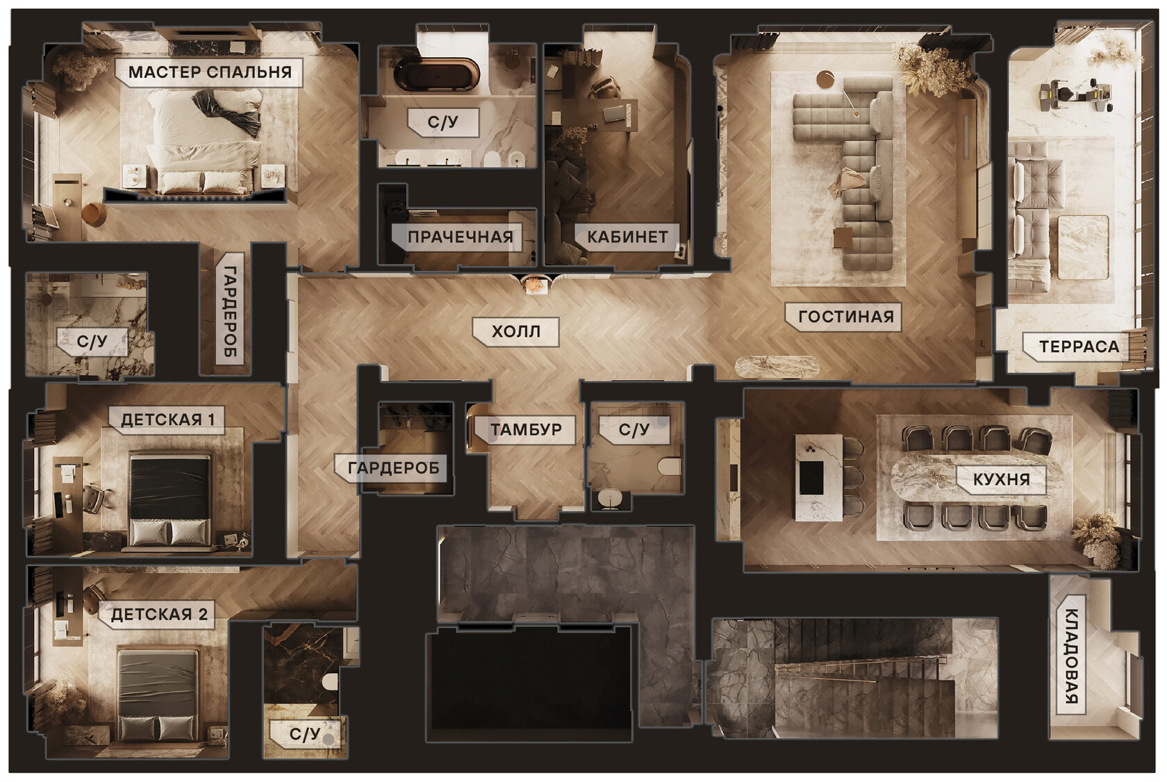 На третьем этаже расположены две квартиры с террасой между башнями. У резидентов этих квартир будет возможность наслаждаться свежим воздухом, не покидая дом